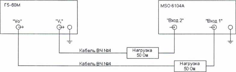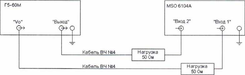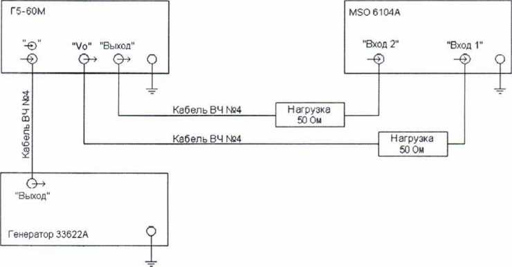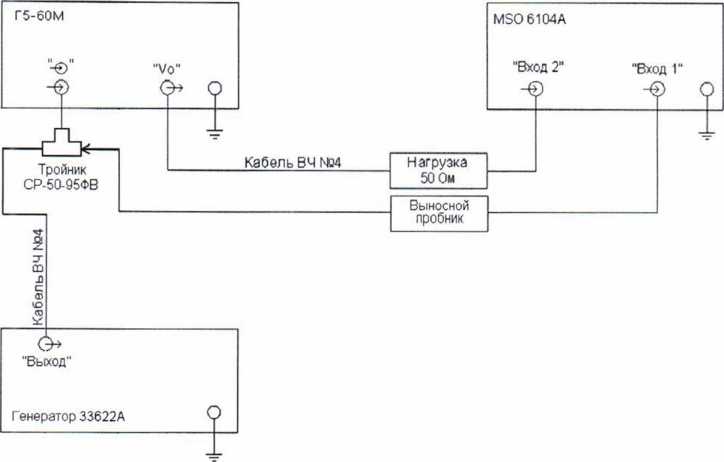 Проверку начальной задержки синхроимпульса Vo относительно импульса внешнего запуска, паразитной модуляции начальной задержки синхроимпульса Vo относительно импульса внешнего запуска провести с помощью генератора сигналов произвольной формы 33622А и осциллографа MSO 6104А (при установленном входном сопротивлении 1 МОм) по схеме соединения приборов, приведенной на рисунке 12, при установленных параметрах сигналов: