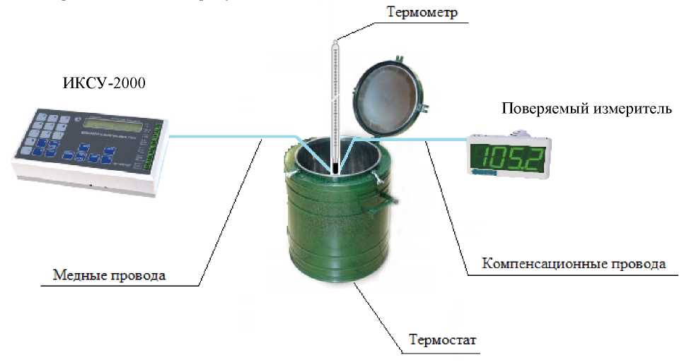 К входу поверяемого измерителя подключают термоэлектродные (компенсационные) провода. Концы проводов соединяют с медными проводами и их спаи (свободные концы) помещают в термостат со стабильной температурой.