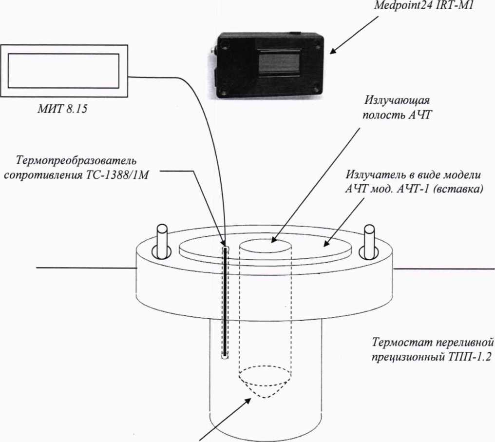 6.3.2.1 Установить излучатель в виде модели АЧТ мод. АЧТ-1 в рабочую зону жидкостного термостата переливного типа. Чувствительный элемент термопреобразователя сопротивления с ИСХ (ТС), подключенного к измерителю температуры, поместить в соответствующее отверстие в излучающей полости АЧТ-1 (см. Приложение 2).