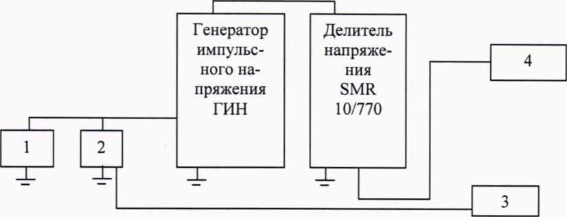 1 - Заряжающий генератор от ГИН; 2 - Делитель напряжения ДН-100э; 3 - Мультиметр цифровой 34450А; 4 - Регистратор микросекундных импульсов Ресурс-РИ.