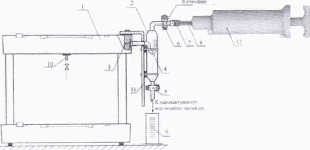 6.3.3 По завершении вытекания воды из U-образной трубки уравнительного сосуда закрыть выход крана 6 «к насосу» и открыть выход «в атмосферу».