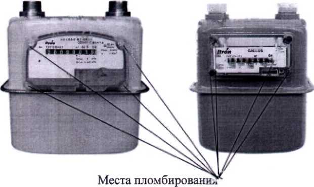 Рисунок 1- вид счетчиков газа диафрагменных GALLUS и мест пломбирования