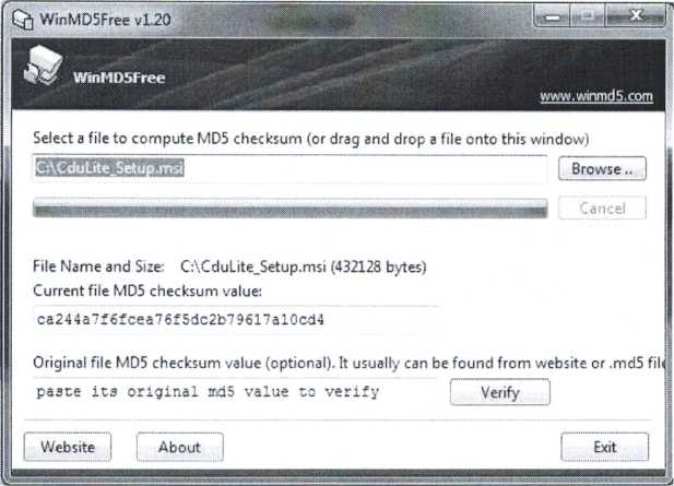 7.2.1.1.3 На ПК с установленным ПО «CDU_Lite» запустить ПО «WinMD5 Free».
