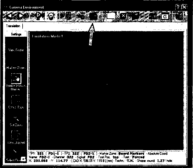 В появившемся окне «Camera Environment» при помощи мыши или джойстика совместить курсор с изображением реперного знака на плате, как показано на рисунке 14. Нажать на кнопку «Translate». Далее курсор автоматически переместится на второй реперный знак. При необходимости скорректировать положение курсора на реперном знаке. Для сохранения результата нажать на кнопку «Translate», как показано на рисунке 14.