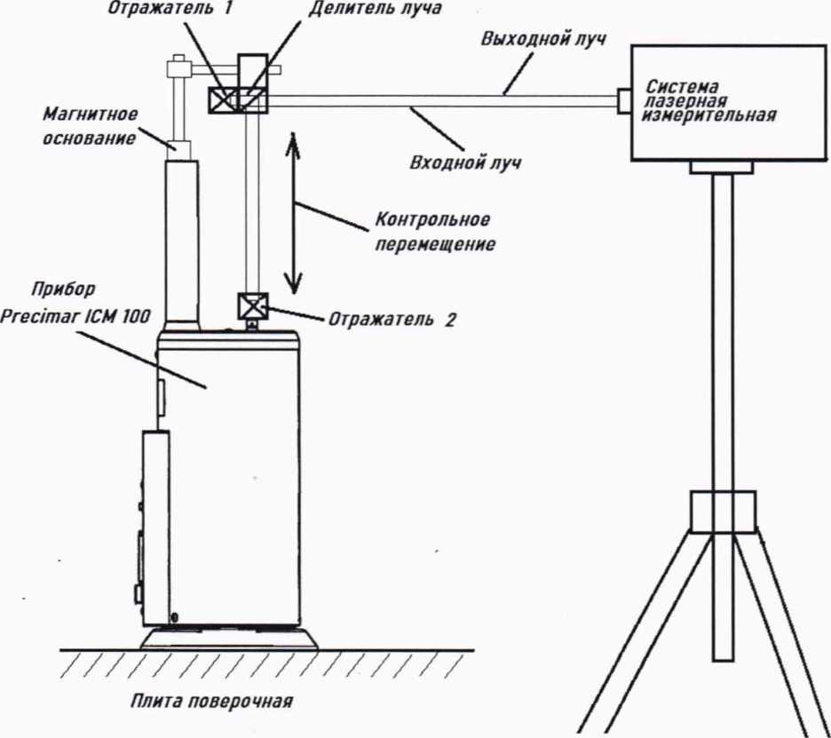 Используя специальную подставку, расположить прибор в горизонтальном положении на поверочной плите. Установить магнитное основание на плиту и закрепить на нем блок делителя луча и отражатель 1, как показано на рисунке 2. Установить лазерную измерительную систему на штативе напротив делителя луча. На отражателе 2 закрепить магнит на двустороннюю клейкую ленту, обеспечив максимально плотный контакт поверхностей магнита и отражателя, и установить конструкцию на измерительный наконечник прибора.