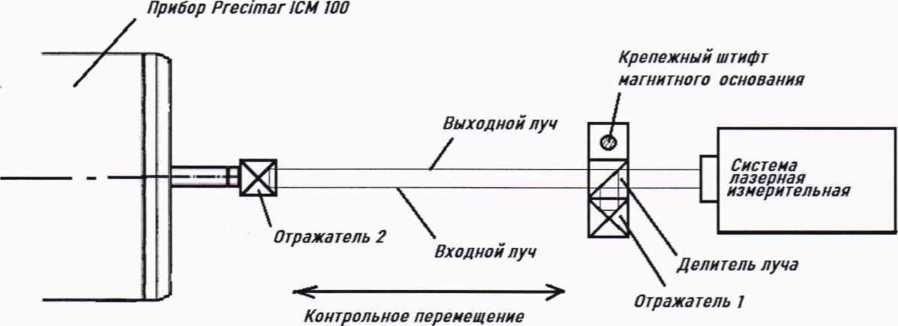 Отраженный от блока делителя входной луч должен быть направлен вдоль направления контрольного перемещения измерительного стержня прибора таким образом, чтобы он попадал в отражатель 2. Отраженный (выходной) луч после прохождения всей оптической системы должен попасть обратно в лазерную измерительную систему.