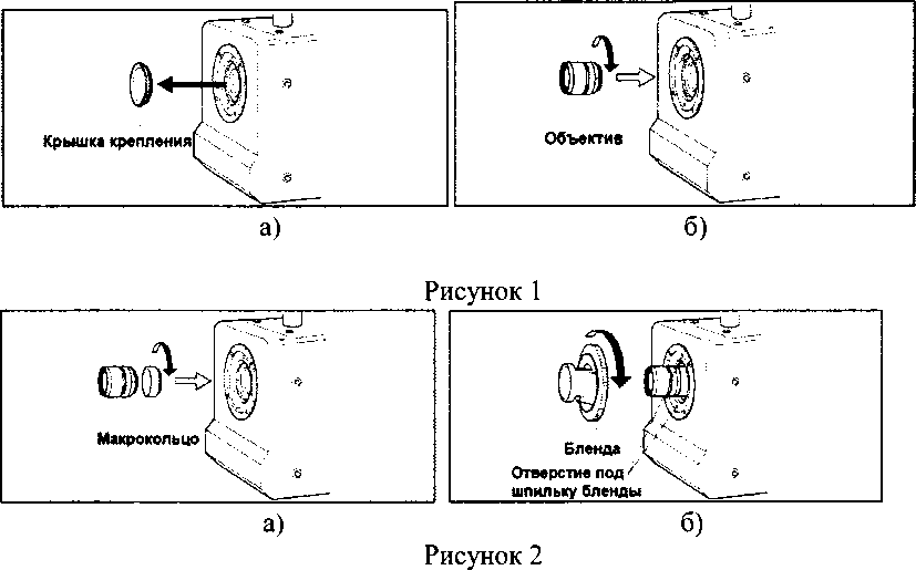 7.4.1 Снять крышку-заглушку с места крепления объектива на корпусе прибора (рисунок 1, а). Взять стандартный объектив, входящий в комплектацию приборов, руками за края и вставьте его в оправу, вращая по часовой стрелке до полной фиксации (рисунок 1, б). При использовании макрокольца вставьте его между объективом и оправой объектива (рисунок 2, а).