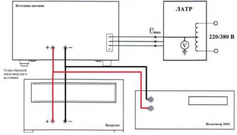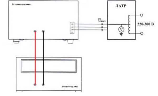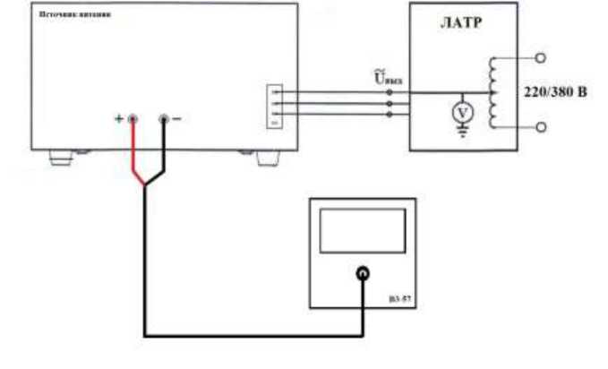 7.10.1 Собрать измерительную схему, представленную на рисунке 2. Подключить вход сетевого питания поверяемого источника к выходу автотрансформатора (далее - ЛАТР). На ЛАТР установить напряжение, равное номинальному, контролируя его при помощи мультиметра АРРА 505. Вольтметр подключить к выходу поверяемого источника.