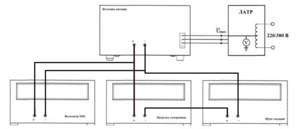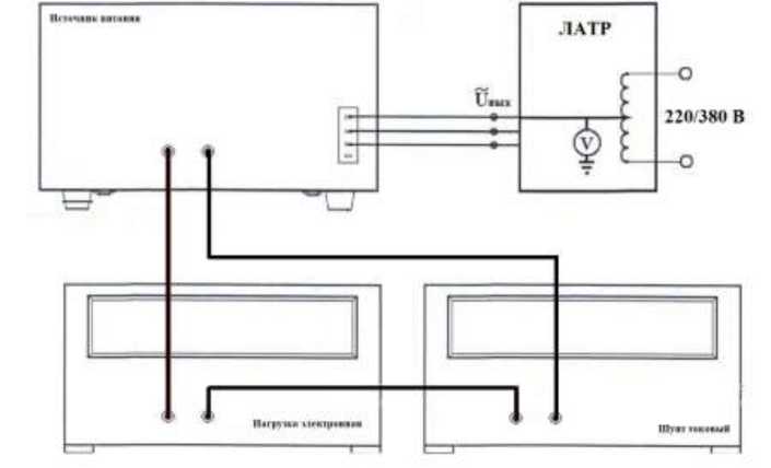 7.11.1 Собрать измерительную схему, представленную на рисунке 5. Подключить вход сетевого питания поверяемого источника к выходу ЛАТР. На ЛАТР установить напряжение, равное номинальному, контролируя его при помощи мультиметра АРРА 505.
