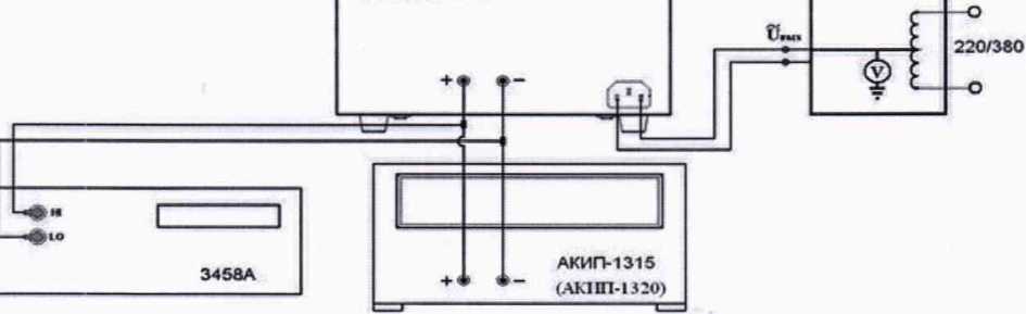 разъемы поверяемого источника питания соединить при помощи измерительных проводов с соответствующими разъемами нагрузки электронной АКИП-1315 (АКИП-1320) и мультиметра 3458А (см. рисунок 1);
