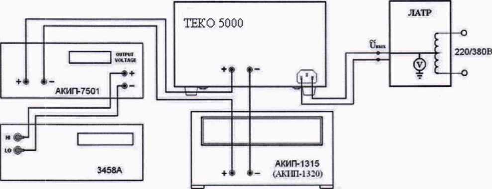 7.4 Определение абсолютной погрешности воспроизведений/измерений напряжения постоянного тока на выходе проводят с помощью лабораторного автотрансформатора «Штиль» TSGC2-30-B (далее - ЛАТР), нагрузок электронных АКИП-1315 (АКИП-1320) и мультиметра 3458А.