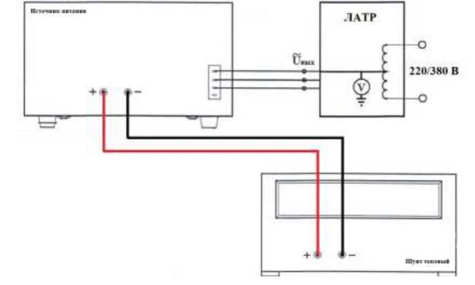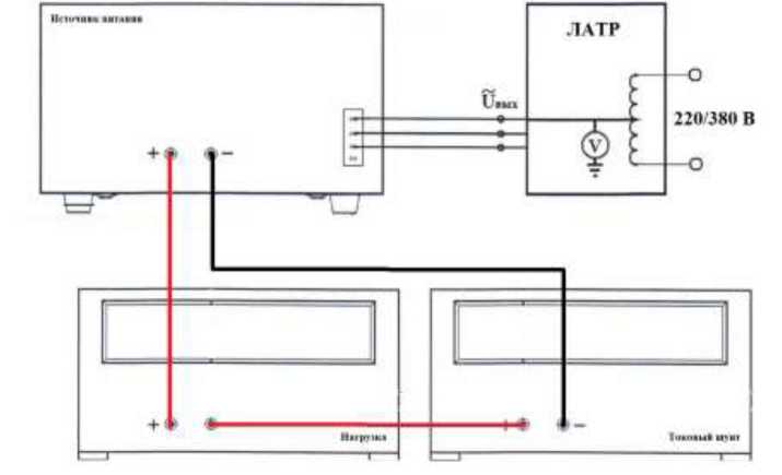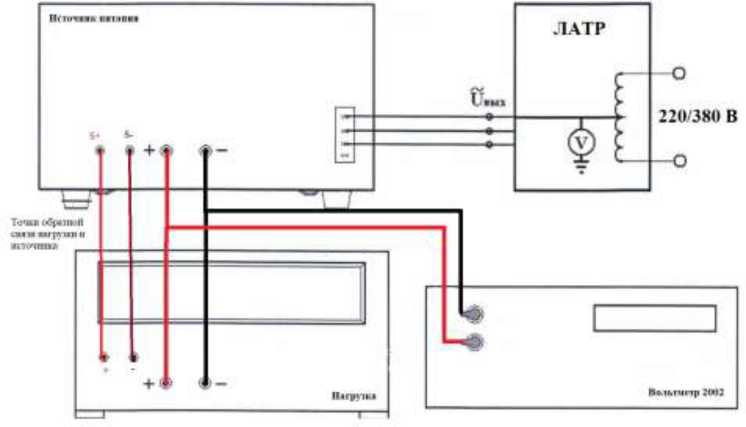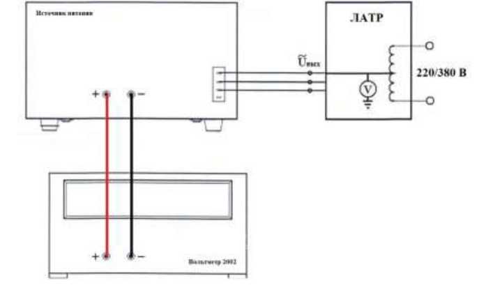 7.11.1 Собрать измерительную схему, представленную на рисунке 8. Подключить вход сетевого питания поверяемого источника к выходу ЛАТР. На ЛАТР установить напряжение, равное номинальному напряжению питания источника (в зависимости от варианта исполнения источника), контролируя его при помощи мультиметра АРРА 505. Подключение производить по однофазной или трехфазной схеме в зависимости от варианта исполнения источника.