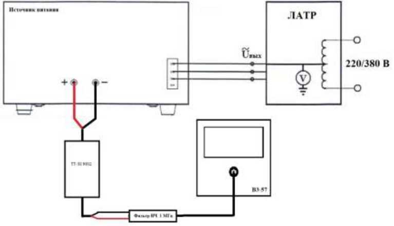 7.11.5 При значениях выходного напряжения менее 300 В, измерение уровня пульсаций выходного тока поверяемого источника проводить путем прямого подключения вольтметра В3-57. При значениях выходного напряжения более 300 В, измерение уровня пульсаций выходного напряжения поверяемого источника проводить при помощи дифференциального пробника TT-SI 9002 и вольтметра В3-57.
