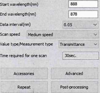 8.4.2.3 Установить настройки для проведения измерений значений спектрального коэффициента направленного пропускания в соответствии с руководством по эксплуатации на спектрофотометры. Применяется метод измерений «Transmittance» (Пропускание). В окне «Unknown Sample» установить повторяемость «Repeat Count» 5 и нажать клавишу «Ок». Измерения СКНП в УФ и видимой области проводят при спектральной ширине щели «Slit Width» 1 нм, в ближней ИК области при спектральной ширине щели «Slit Width» 2 нм.