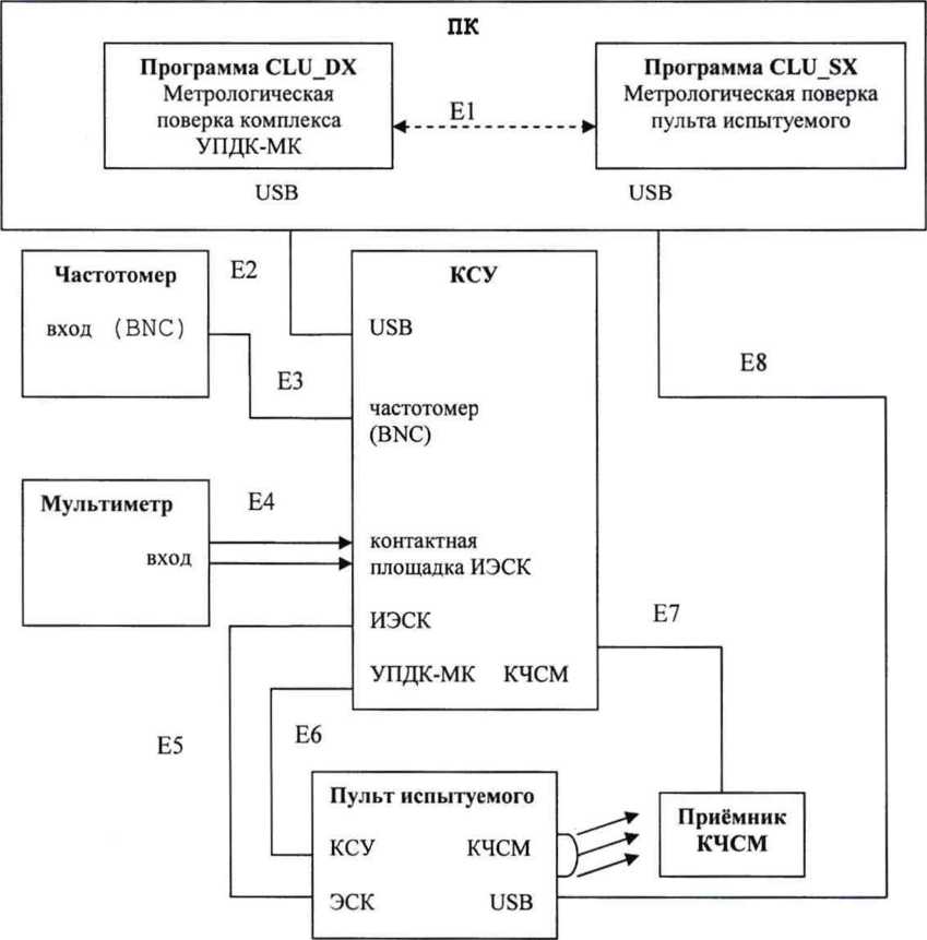 Схема поверки состоит из персонального компьютера, мультиметра, коммутационносогласующего устройства (КСУ), датчика ЭСК, пульта испытуемого, программы CLU_SX и программного обеспечения поверки - программы CLU_DX.