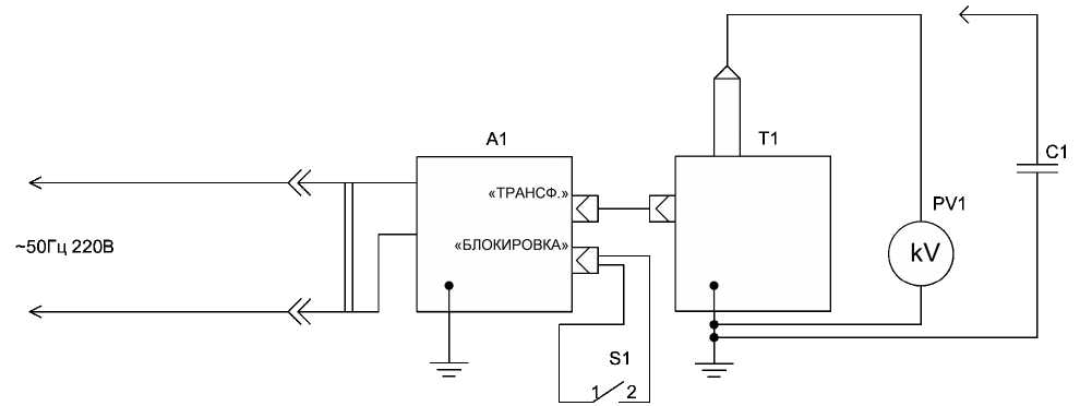 Блоком измерения А1 по киловольтметру PV1 (см. Приложение А, Рис. 1) плавно доводят напряжение переменного тока на выходе блока высоковольтного Т1 до 51±1 кВ, напряжение постоянного тока на выходе до 71±1 кВ (при испытании на постоянном токе к выходу высоковольтного блока присоединяется конденсатор C1). В обоих случаях наблюдают автоматическое отключение высокого напряжения установкой. Индикатор «Выходное напряжение» на передней панели устанавливается в нулевые показания при безъемкостной нагрузки или отображает значение выходного напряжения при емкостной нагрузке, внешняя сигнальная лампа индикации высокого напряжения, подключенная к разъему «БЛОКИРОВКА» гаснет.