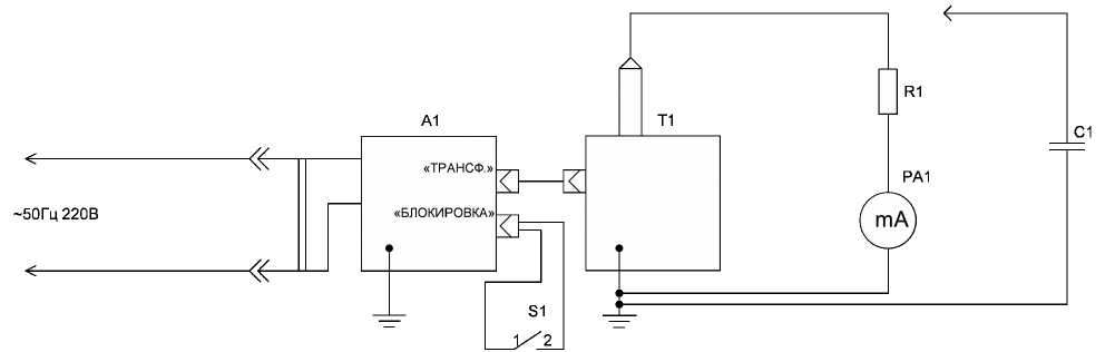 Включить установку. Плавно регулируя величину тока нагрузки, убедиться, что установка позволяет обеспечивать измерение силы тока, сравнивая показания силы тока установки и эталонного миллиамперметра PA1. Результаты испытания считаются удовлетворительными, если показания установки находятся в диапазоне измерения 0,05... 35,0 мА при переменном напряжении и 0,05.15,0 мА при постоянном напряжении соответственно (при испытании на постоянном токе к выходу высоковольтного блока присоединяется конденсатор C1).