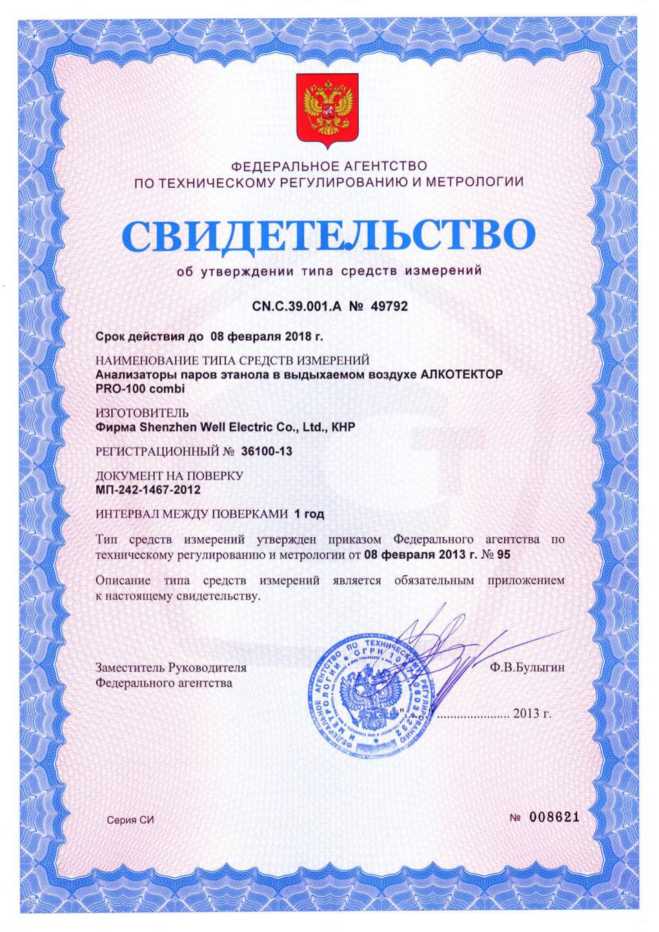 Анализаторы паров этанола в выдыхаемом воздухе АЛКО-ТЕКТОР PRO-100 combi зарегистрированы в Государственном реестре средств измерений РФ под № 36100-13, свидетельство об утверждении типа средств измерений CN.C.39.001.A № 49792, срок действия до 08.02.2018 г.