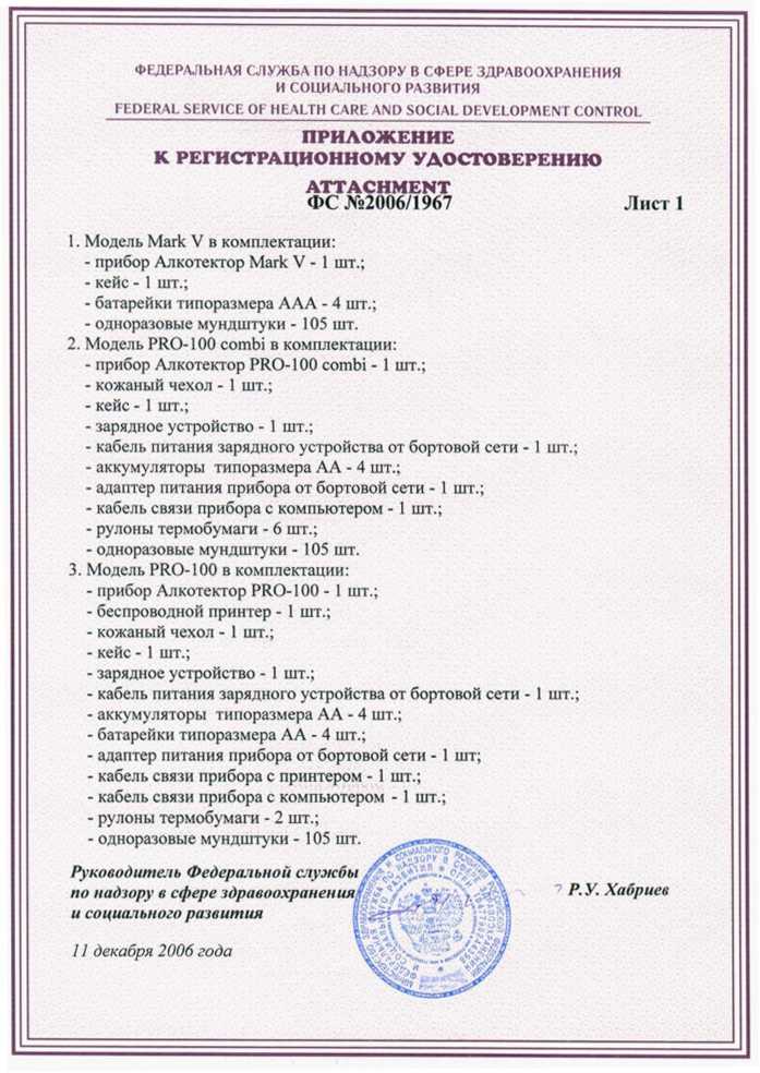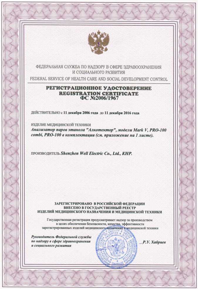 Анализаторы паров этанола в выдыхаемом воздухе АЛКОТЕКТОР PRO-100 combi зарегистрированы Федеральной службой по надзору в сфере Здравоохранения и социального развития (регистрационное удостоверение ФС № 2006/1967 от 11 декабря 2006 г., срок действия до 11 декабря 2016 г.), внесены в Государственный реестр изделий медицинского назначения и медицинской техники и разрешены к применению на территории РФ.