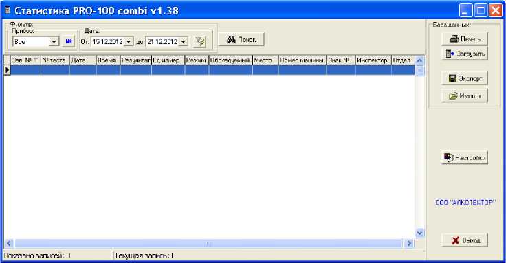 ВНИМАНИЕ! При загрузке данных из памяти анализатора по умолчанию установлен фильтр для вывода в рабочее окно данных за последние 7 дней по отношению к текущей дате.