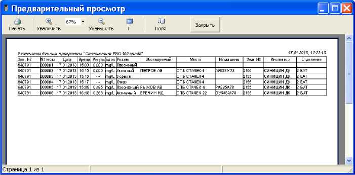 чего окна программы позволяет вывести на печать те протоколы измерений из базы данных, которые на данный момент находятся в рабочем окне.