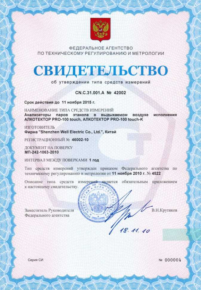 Анализаторы паров этанола в выдыхаемом воздухе АЛКОТЕКТОР PRO-100 touch внесены в Государственный реестр средств измерений РФ под № 46002-10, свидетельство об утверждении типа средств измерений CN.C.31.001.A № 42002, срок действия до 11.11.2015 г.