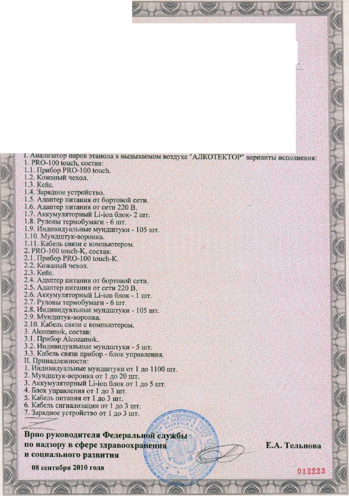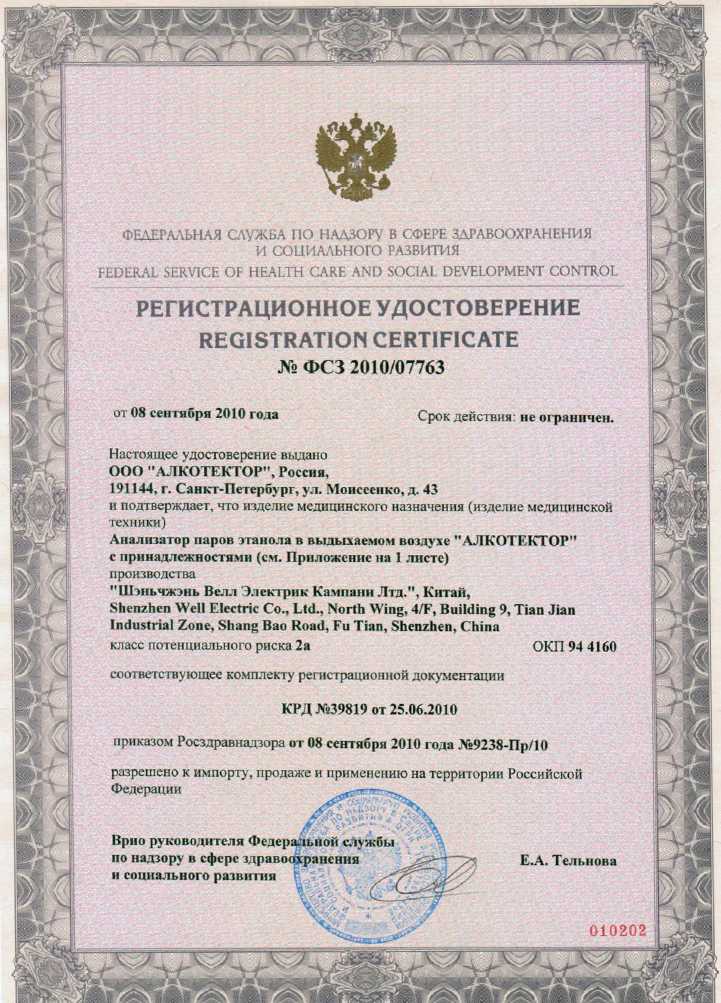 Анализаторы паров этанола в выдыхаемом воздухе АЛКОТЕКТОР PRO-100 touch зарегистрированы Федеральной службой по надзору в сфере Здравоохранения и социального развития и разрешены к импорту, продаже и применению на территории РФ, регистрационное удостоверение № ФСЗ 2010/07763 от 08 сентября 2010 года с неограниченным сроком действия.