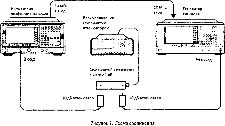 генератор сигналов E8257D; генератор шума 346СК01 (диапазон рабочих частот от 0,01 до 50 ГГц, пределы абсолютной погрешности воспроизведения СПМШ от ± 0,22 до ± 0,34 дБ) аттенюатор ступенчатый программируемый 84908М (диапазон частот от 0 до 50 ГГц; абсолютная погрешность ослабления ± (0,8+0,04F)) |