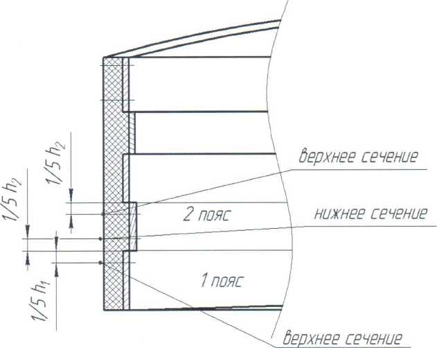 Д.2.1 Высоту i-ro пояса резервуара (рисунок А.7), как расстояние по вертикали от верхнего края /-го пояса резервуара, hj, мм, вычисляют по формуле