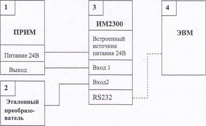 1- поверяемый преобразователь, 2 - эталонный преобразователь поверочной установки с импульсным выходом, 3 - прибор ИМ2300, 4 - персональный компьютер.