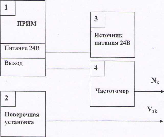 1 - поверяемый преобразователь, 2 - поверочная установка для определения погрешностей методом измерения объёма, 3 - источник питания 24В, 4 -частотомер.