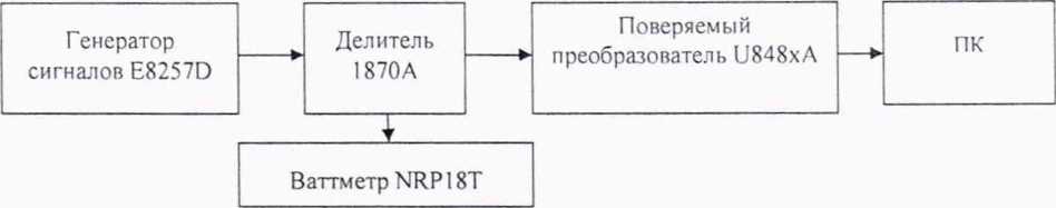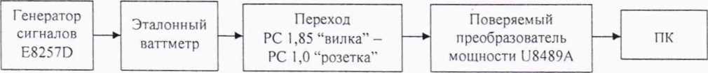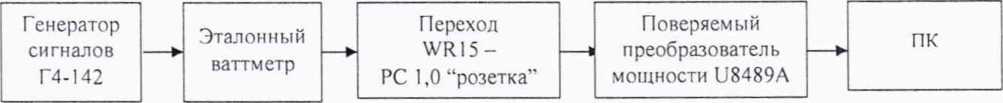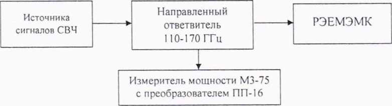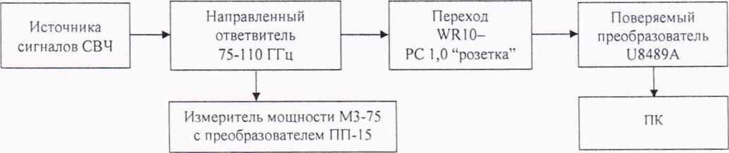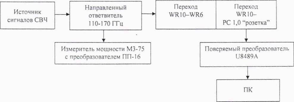 Подключить к выходу направленного ответвителя волноводно-волноводный переход WR10-WR6 из состава РЭЕМЭМК, переход PC 1.0-WR10 и поверяемый преобразователь U8489A по схеме, приведенной на рисунке 11.