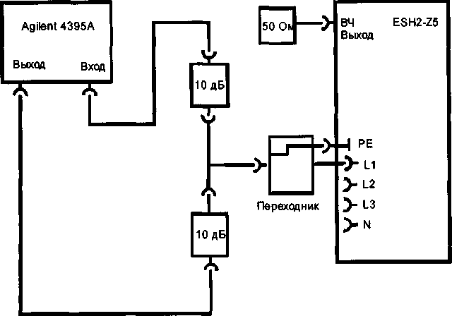 7.3.1 Подключить анализатор спектра Agilent 4395А к входам (L1 и РЕ) разъема подключения ИТС эквивалента сети питания и провести измерения модуля и аргумента входного полного сопротивления на частотах, указанных в таблице 1.