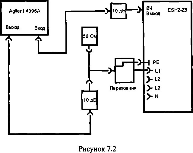 7.4.3 Собрать схему измерений в соответствии с рис. 7.2 и провести измерения на выходе эквивалента сети (Пвых, дБмкВ) на частотах, указанных в таблице 2.
