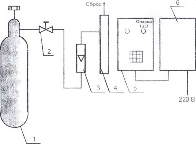 1 - баллон с ГСО-ПГС: 2 - вентиль точной регулировки, 3 -индикатор расхода; 4 - насадка (показана условно), 5 - блок датчика Системы, 6 - БПСУ