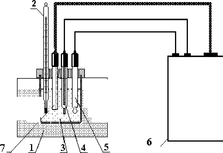 1 - термостат водяной; 2 - термометр ртутный стеклянный лабораторный; 3 - стакан с буферным раствором - рабочим эталоном pH; 4 - электрод сравнения (вспомогательный электрод) из состава прибора; 5 - измерительный (стеклянный) электрод из состава прибора; 6 - измерительный преобразователь из состава прибора; 7 - термокомпенсатор с соединительным кабелем.