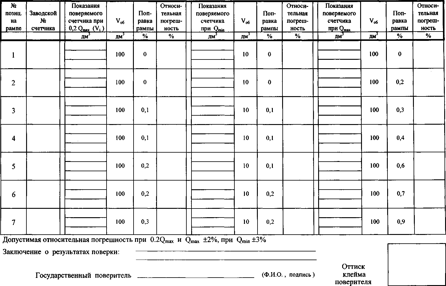 7.2. Счетчики газа, прошедшие поверку с положительными результатами: допустимая относительная погрешность при 0,2 Qmax и Qmax ±2%, при Qmin ±3%, подлежат клеймению (пломбировке).