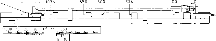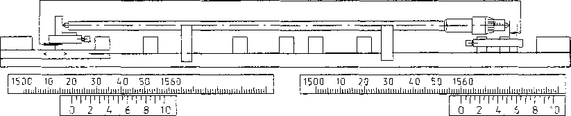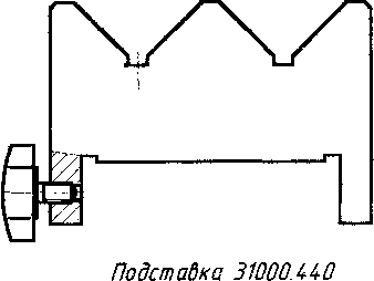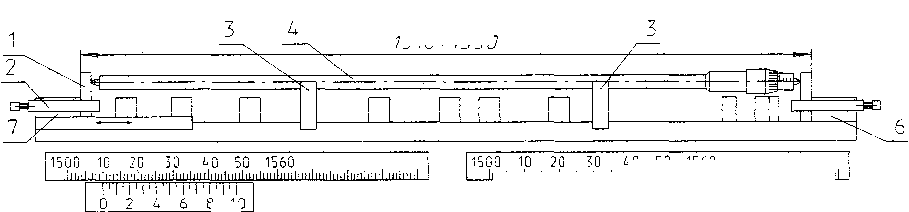 упоров 6 и 7. Устанавливают на станине стенда подставки 3 (31000.440), расположив их на расстоянии 200...250 мм от упоров. Устанавливают каретку стенда в положение, соответствующее отсчету «1510» и фиксируют стопорным винтом. Дважды измеряют (по ширине упора) с помощью нутромера НМ 2500 расстояние между боковиками, уложив нутромер на подставки, поочередно в каждую из двух пар их гнезд. При измерении необходимо учитывать размеры двух боковиков.