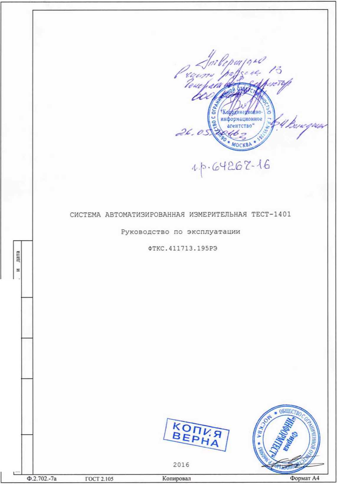 Методика поверки «СИСТЕМА АВТОМАТИЗИРОВАННАЯ ИЗМЕРИТЕЛЬНАЯ ТЕСТ-1401» (РЭ ФТКС.411713.195)
