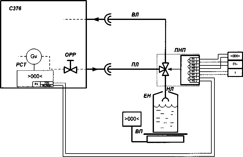 С376 - стенд универсальный С376, РСТ - расходомер-счётчик РСТ, ОРР - органы регулировки расхода, ПЛ - подающая линия, ВЛ - возвратная линия, НЛ - линия налива, ЕН - сменная наливная ёмкость, ВП -весы платформенные, ПНП - переключатель направления потока, ЧЭС - частотомер электронно-счётный, ГНЧ - генератор сигналов низкочастотный, ИИВ - измеритель интервалов времени