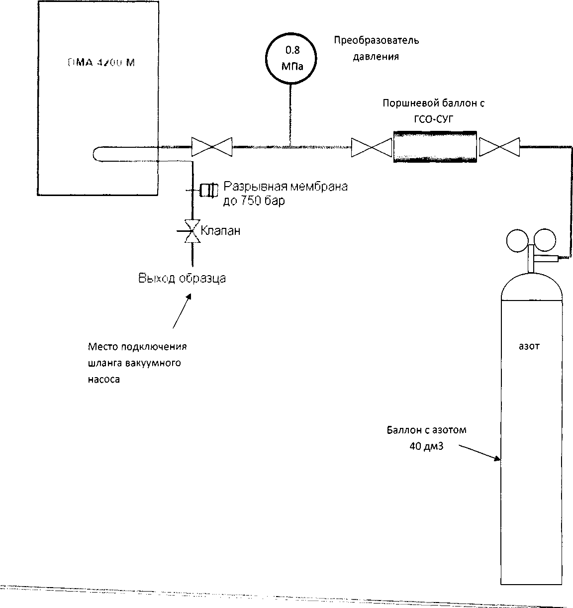 6.4.3.1 Внутренняя полость измерительной ячейки анализатора должна быть предварительно промыта растворителем и высушена. На входной и выходной фитинги измерительной ячейки анализатора устанавливают запорные краны. Выполняют подключение баллона с газообразным Азотом под давлением к запорному крану входного фитинга измерительной ячейки анализатора плотности посредством гибкой трубки из нержавеющей стали, диаметром 3 мм. В линию подачи газа должен быть включен преобразователь давления. К крану выходного фиттинга измерительной ячейки подключают гибкий вакуумный шланг вакуумного насоса. Схема подключения оборудования приведена в Приложении 3.