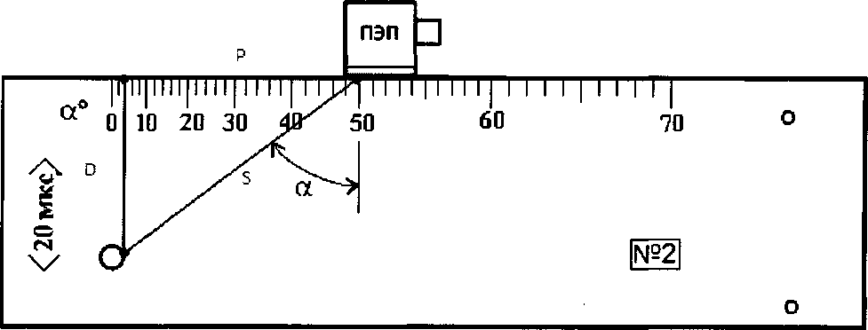 8.8.1 Определение погрешности измерения координат дефекта при наклонном прозвучивании выполняется с наклонными ПЭП, входящими в комплектность дефектоскопа, на мере №2 из комплекта ККО-3.