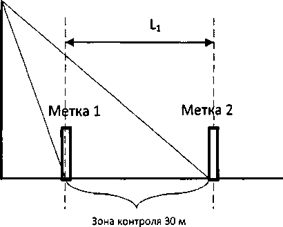 7.4.3.1 По видеоизображению проверяемой видеокамеры комплекта 1, расположить метку 1 (с номером) в начале зоны распознавания, а метку 2 (с отражающей пластиной) в конце зоны распознавания по направлению к видеокамере (согласно схеме, приведенной на рисунке 1). Пластина и номер расположены на высоте установки ГРЗ ТС.