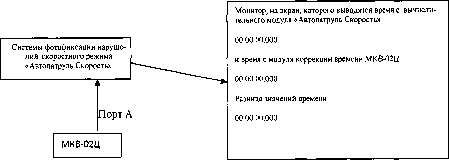 Запустить на системе «Автопатруль Скорость» программное обеспечение TimeCorrection.exe. Подключить модуль коррекции времени к соответствующему порту (порт А) и убедиться в наличии индикации текущего времени системы (измеренного времени), времени модуля МКВ-02Ц (эталонного времени) и разницы этих значений времен в окне программы TimeCorrection.exe. Провести измерения интервала времени 1 секунда и зафиксировать (сделать снимок (скриншот) экрана) показания эталонного и измеренного времени. Зафиксировать не менее 5 измерений и результаты отразить в протоколе испытаний.
