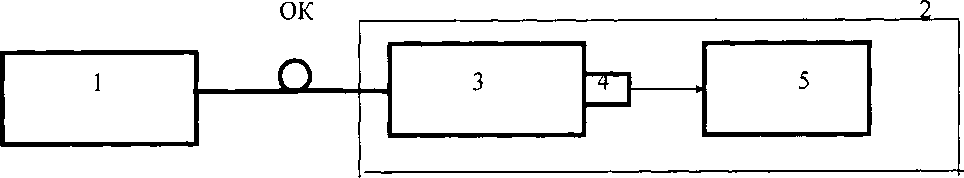 1 - испытываемая система; 2 - установка для измерений спектральных характеристик приёмников и источников оптического излучения в волоконно-оптических системах передачи (ВОСП) из состава рабочего эталона средней мощности оптического излучения в ВОСП «РЭСМ-ВС» (далее по тексту - СУ); 3 - монохроматор; 4 - фотоприемное устройство; 5 - регистратор, ОК - оптический кабель