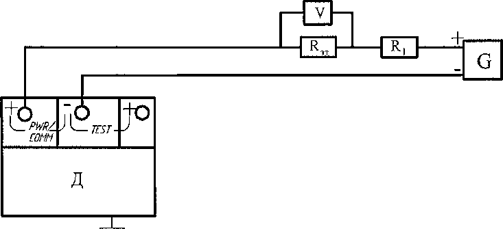 R - нагрузочное сопротивление, например, резистор МЛТ или магазин сопротивлений, указанный в таблице 1 (п. 2.1); значение сопротивления - в соответствии с условиями поверки (п. 4.1).