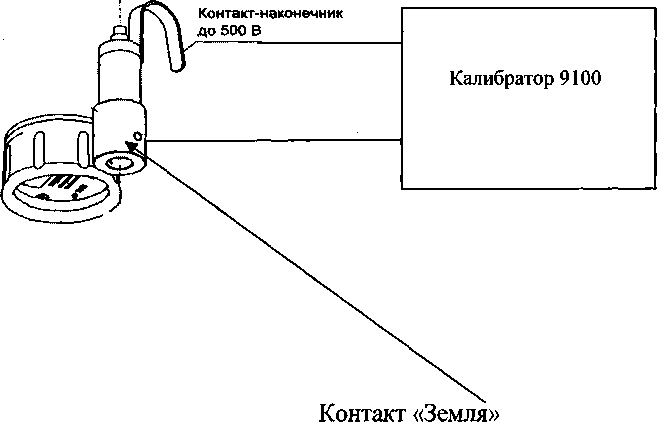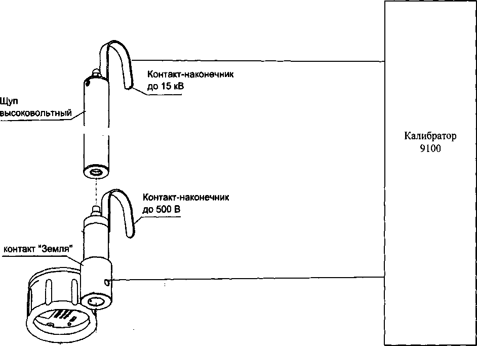 - подключают калибратор к измерителю (с предварительно подсоединенным высоковольтным щупом) в соответствии с рисунком 2;