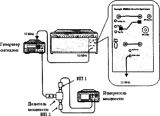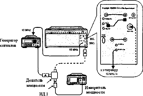 7.9.1 Соединить выходы двух генераторов сигналов через аттенюаторы 10 дБ со входами делителя.