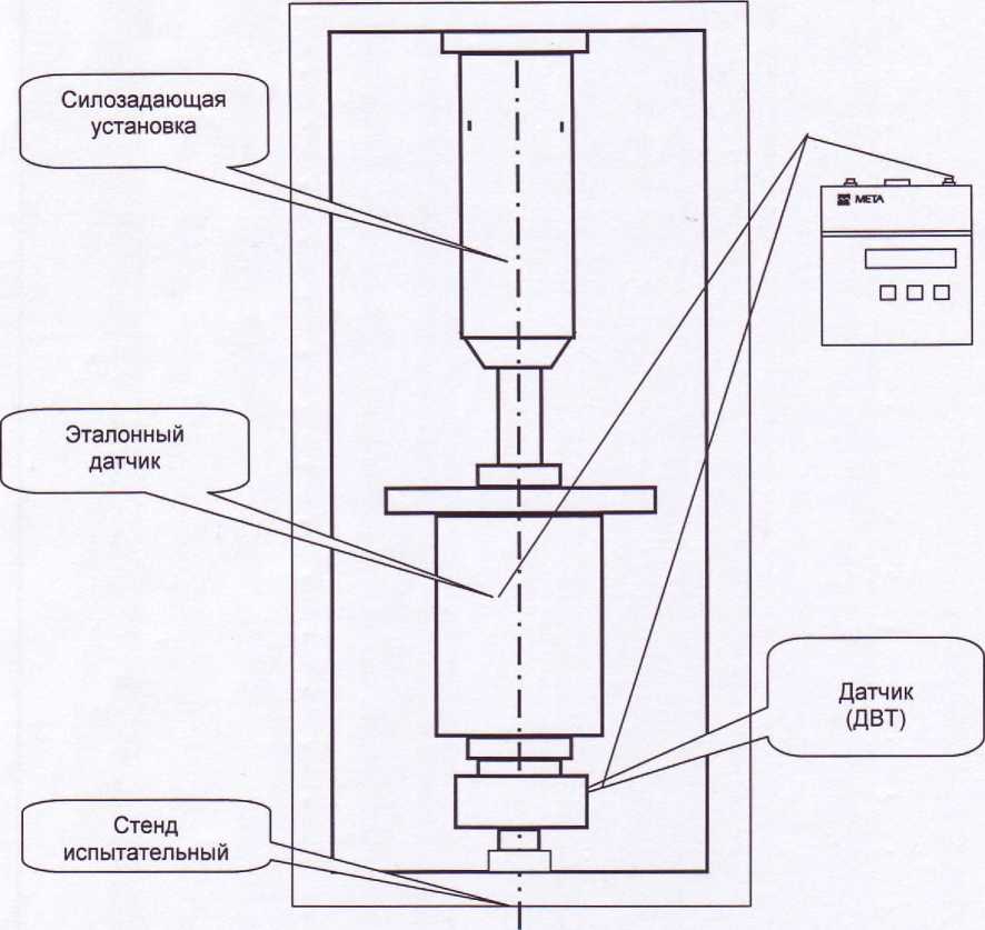 б) установить датчик тензорезисторный в установку силозадающую прямого нагружения (см. рисунок 1). Выполнить установку нулевых показаний устройства при ненагруженном датчике в соответствии с п.2.3.1.1) М 038.000.00 РЭ. После этого на индикаторе должно появиться нулевое значение показаний.