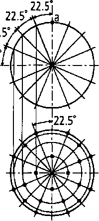 - восемь точек (равномерно расположенных) на 90° ниже вершины, т.е. на диаметре и повернутых относительно предыдущей группы на 22,5°.